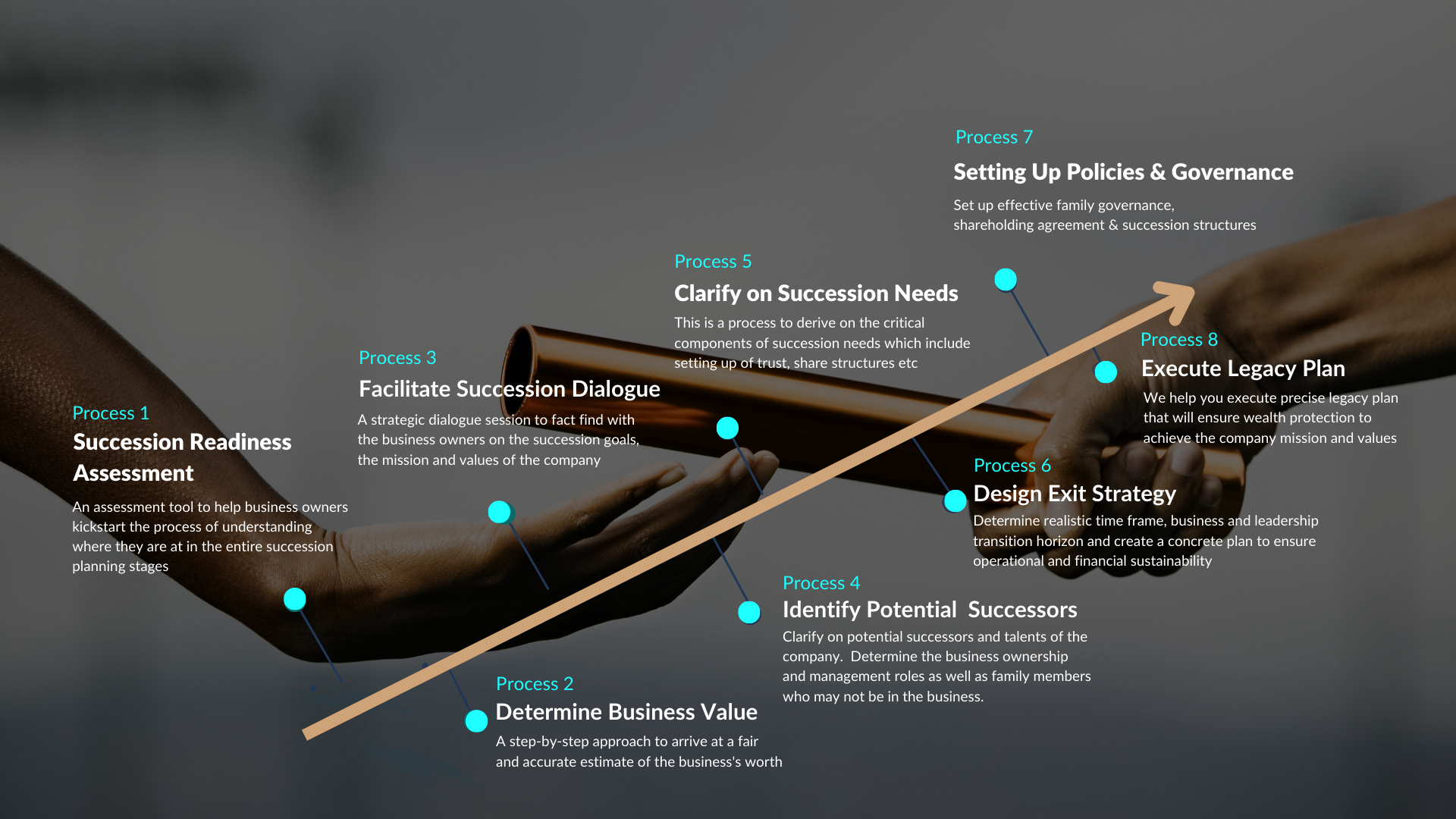 We care for the business because people matter. Often, leaders need an extra pair of hands to guide them to realise the goals because they are faced with multiple challenges. We close critical business gaps that include business ethics and governance, business continuity blueprint, steps to healthy cash flow, business valuation, business acceleration blueprint, shareholders’ exit strategy, and more to achieve smoother succession and brand preservation.